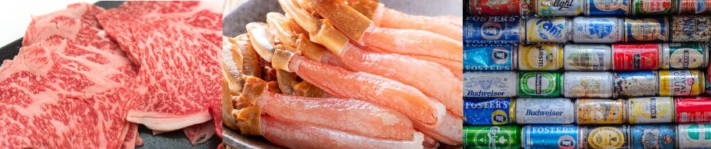 自分では買わないような「高級和牛(神戸牛・飛騨牛等)」や「海鮮(いくら・カニ)」のほか、家計を助ける「飲料1ケース」「カップ麺詰合せ」といった実用的なセットが人気を二分しています。